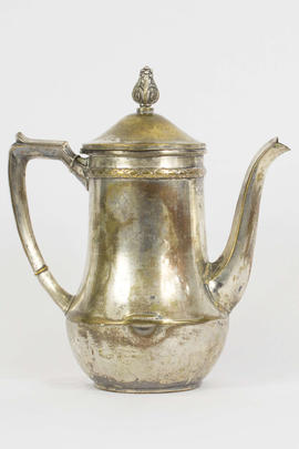 Utensílio de cozinha de alumínio utilizado para preparo bebida quente, especificamente chá. Sua base redonda e embaixo bojuda, com um bico na parte frontal e uma alça na parte traseira. Na parte superior há o desenho de uma fita trançada em alto relevo. Há uma tampa logo acima presa em seu corpo com um pino acima com desenhos em alto relevo.