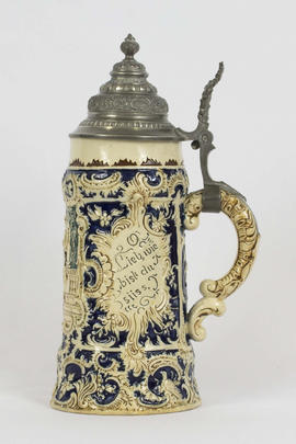 Utensílio de cozinha/ cerâmica, utilizado para colocar líquidos, especificamente cerveja, com capacidade de até meio litro. Em formato de um cilindro, fundo de cor bege, desenho tradicional de realeza alemão trabalhado em alto e baixo relevo em seu corpo e em sua alça. Nas laterais de seu corpo há duas inscrições em alemão, sendo que a primeira: "Lieb, wie bist du bitter", segundo o Google Tradutor: "Amando como você é amarga"; a segunda: "Lieb, wie bist du süss", tradução do Google Tradutor: "O amor, como você está doce". No centro, entre essas frases há o desenho de um cavalheiro com uma espada e uma dama se entreolhando dentro de um palácio. Entre os desenhos identificados na peça há flores, pássaros. Há uma parte do fundo externo do utensílio oca, com a inscrição de "527" e "3" em números arábicos. Há uma tampa, cujo material de metal e desenhos em arabescos com uma ponta, como chapéu de bruxa; seu modo de abrir é continuação da tampa e unido à sua alça com a forma de duas pombas.